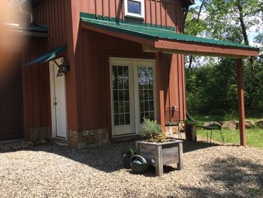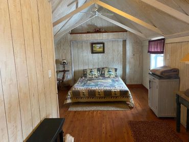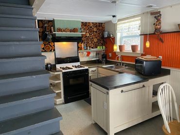 The upper level has a queen size bed with sitting room, plus a murphy style single bed. Downstairs has a full kitchen, with dining area, and a full bathroom. There's a covered sitting area outside, as well as a fire pit. This place is just plain cute.