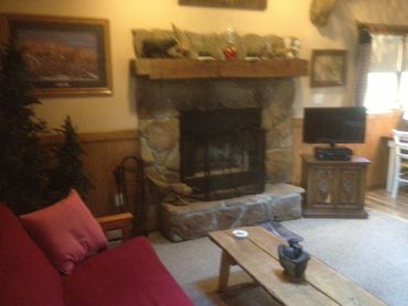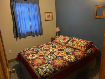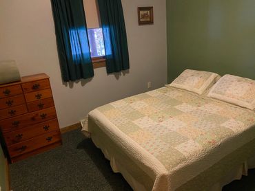 This cabin offers three bedrooms and one full bathroom. Each bedroom is equipped with a queen size bed. You'll find a fully stocked kitchen with dining area. The living room provides a fold out bed option too.